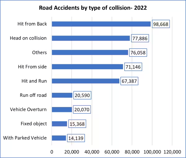 मंत्रालय की रिपोर्ट से यह बेहद चौकाने वाला आंकड़ा मिलता है कि सड़क पर गाड़ियों की आमने-सामने की टक्कर की संख्या, पीछे से टक्कर मारे जाने की संख्या से कम है। गाड़ियों के आपस में टकराने की कुल घटनाओं में ‘आमने-सामने की टक्कर’ की संख्या 16.9 प्रतिशत है। जबकि पीछे से टक्कर मारने की संख्या 21 प्रतिशत से अधिक।