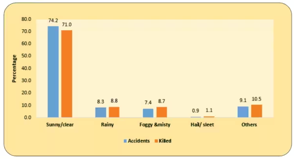 लगभग तीन-चौथाई दुर्घटनाएं और मौतें साफ मौसम (जिसमें धूप निकली थीं और सब कुछ साफ दिख रहा था) में हुईं। प्रतिशत में कहें तो, 74.2 फीसदी सड़क दुर्घटनाएं, ऐसे मौसम में हुई जब धूप निकली हुई थी। वहीं बारिश, कोहरे और ओलावृष्टि जैसी प्रतिकूल मौसमी परिस्थितियों में होने वाली दुर्घटनाएं कुल सड़क दुर्घटनाओं का लगभग 16.6 प्रतिशत थीं।