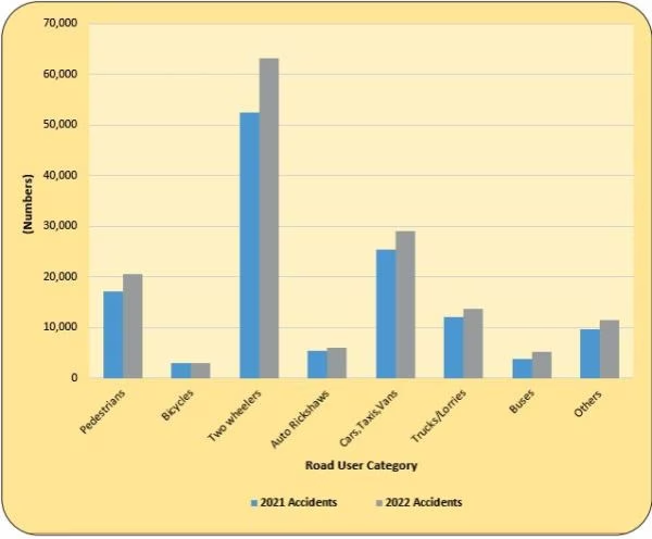 2022 में दोपहिया वाहनों से जुड़ी कुल 63,115 दुर्घटनाएं हुईं। इनमें 25,228 मौतें हुईं। इसके बाद नंबर आता है कार में चलने वालों का और पैदल चलने वालों का। कार से सड़क दुर्घटना के 29,005 मामले हुए, इसमें 10,174 मौतें हुईं। वहीं पैदल चलने वाले 10,160 लोग सड़क दुर्घटना में मारे गए।