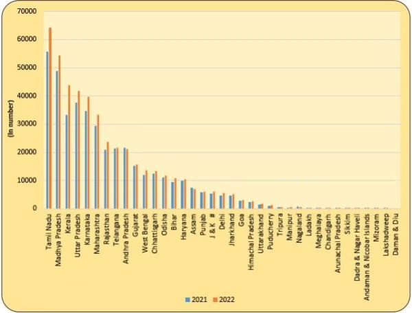 तमिलनाडु में कुल 64,105 सड़क दुर्घटनाएं दर्ज की गईं, जो पिछले वर्ष से 15.1 प्रतिशत अधिक हैं। यह भारत में दर्ज कुल दुर्घटनाओं का 13 प्रतिशत से अधिक है। तमिलनाडु के बाद मध्य प्रदेश का नंबर आता है, जहां 54,432 दुर्घटनाएं दर्ज की गईं।