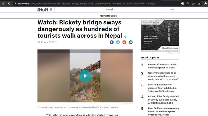 इस खबर में घटना का वीडियो भी दिखाया गया है। लेख में कहा गया है: मंदिर जाने वाले लोग नेपाली नववर्ष के लिए एक धार्मिक भवन तक पहुंचने की जल्दी में थे, इसलिए उन्होंने 14 अप्रैल को काठमांडू के पूर्व सांगा प्रांत में जर्जर पुल पर भीड़ लगा दी।
