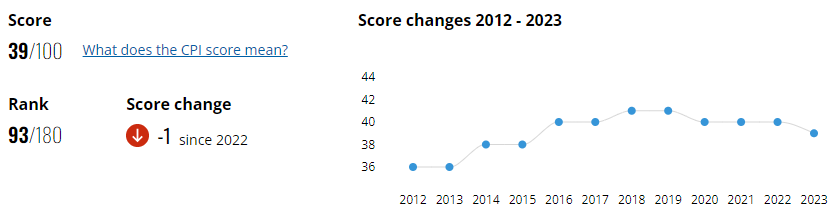 जनवरी, 2024 में ट्रांसपेरेंसी इंटरनेशनल के हवाले से Corruption Perceptions Index-2023 का डेटा जारी हुआ था। इसमें कहा गया है कि भारत भ्रष्टाचार धारणा सूचकांक के मामले में दुनिया भर के 180 देशों में से 93 वें स्थान पर है। साल 2023 में भारत की रैंकिंग 39वीं थी।