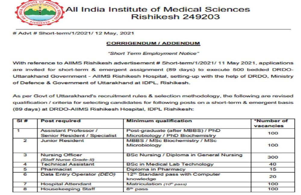 योग्य और इच्छुक उम्मीदवार एम्स ऋषिकेश से 10 मई से 31 मई 2021 (सुबह 11 बजे से दोपहर 2 बजे के बीच) के वॉक-इन-इंटरव्यू में शामिल हो सकते हैं। भर्ती उत्तराखंड सरकार द्वारा आईडीपीएल, ऋषिकेश में डीआरडीओ की मदद से और एम्स ऋषिकेश द्वारा प्रबंधित 500 बिस्तरों वाले कोविड केयर अस्पताल में शॉर्ट टर्म असाइनमेंट (3 महीने) के लिए की जा रही है।
