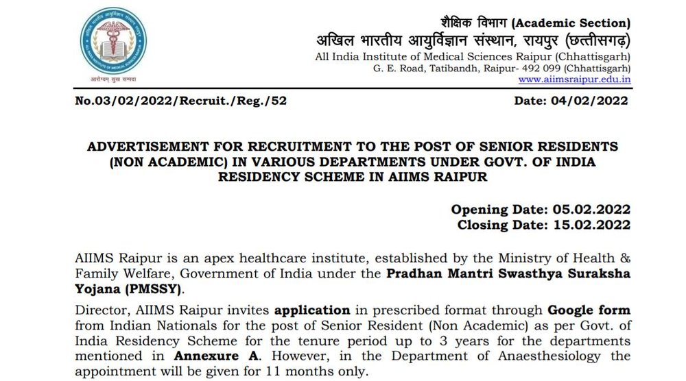 AIIMS Recruitment 2022: ऑल इंडिया इंस्टिट्यूट ऑफ़ मेडिकल साइंसेज (AIIMS) ने सीनियर रेज़िडेंट पदों पर भर्ती के लिए योग्य उम्मीदवारों से आवेदन मांगे हैं। सभी इच्छुक उम्मीदवार AIIMS Raipur Recruitment 2022 के लिए आधिकारिक वेबसाइट aiimsraipur.edu.in पर 15 फरवरी 2022 तक ऑनलाइन आवेदन कर सकते हैं। इन पदों पर भर्ती के लिए आवेदन प्रक्रिया 5 फरवरी से शुरू की जा चुकी है।