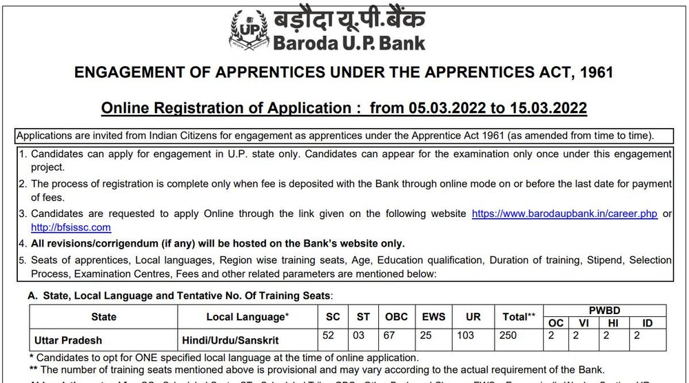 Bank Recruitment 2022: बड़ौदा यूपी बैंक ने अप्रेंटिस एक्ट 1961 के तहत अप्रेंटिस पदों पर भर्ती के लिए योग्य उम्मीदवारों से ऑनलाइन आवेदन मांगे हैं। सभी इच्छुक उम्मीदवार Baroda UP Bank Recruitment 2022 के लिए बैंक की आधिकारिक वेबसाइट barodaupbank.in/career.php या bfsissc.com पर 15 मार्च 2022 तक ऑनलाइन आवेदन कर सकते हैं। इन पदों पर भर्ती के लिए आवेदन प्रक्रिया 5 मार्च से शुरू की गई थी।
