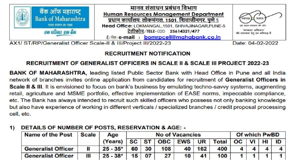 Bank of Maharashtra Recruitment 2022: बैंक ऑफ महाराष्ट्र ने जनरलिस्ट ऑफिसर के पदों के लिए अधिसूचना जारी की है। योग्य उम्मीदवार आधिकारिक वेबसाइट bankofmaharashtra.in पर आवेदन कर सकते हैं। इसके तहत स्केल 2 और 3 में 500 जनरलिस्ट ऑफिसर की भर्ती की जाएगी।