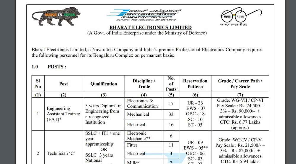 इंजीनियरिंग असिस्टेंट ट्रेनी पदों पर भर्ती के लिए उम्मीदवार के पास किसी मान्यता प्राप्त संस्थान से इंजीनियरिंग में 3 साल का डिप्लोमा होना चाहिए। वहीं, टेक्नीशियन पदों के लिए उम्मीदवार SSLC और आईटीआई पास होना चाहिए। इन पदों पर भर्ती के लिए उम्मीदवार की आयु 28 साल से अधिक नहीं होनी चाहिए। हालांकि, सरकारी नियमों के अनुसार आरक्षित कैटेगरी के उम्मीदवारों को अधिकतम आयु सीमा में छूट दी जाएगी। विस्तृत जानकारी के लिए उम्मीदवार आधिकारिक नोटिफिकेशन चेक कर सकते हैं।