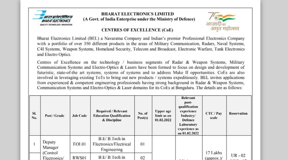 BEL Recruitment 2022: भारत इलेक्ट्रॉनिक्स लिमिटेड (BEL) ने डिप्टी मैनेजर सहित विभिन्न पदों पर भर्ती के लिए आधिकारिक वेबसाइट bel-india.in पर नोटिफिकेशन जारी किया है। सभी योग्य उम्मीदवार BEL Deputy Manager Recruitment 2022 के लिए 18 अप्रैल 2022 तक या उससे पहले आवेदन कर सकते हैं।