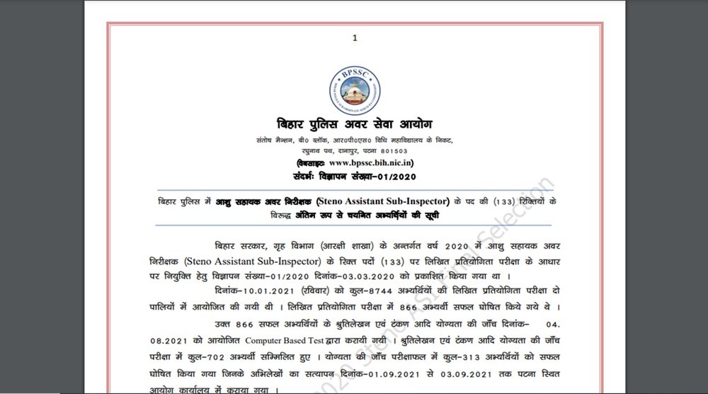 वेबसाइट के होमपेज पर आपको “Results: Final Selection List for the 133 vacant posts of Steno Assistant Sub-Inspector in Bihar Police. (Advt. No. 01/2020) विज्ञापन संख्या-01/2020 के अंतर्गत बिहार पुलिस बल में वर्ष 2020 में आशु सहायक अवर निरीक्षक के पद की 133 रिक्तियों के विरूद्ध अंतिम रूप से चयनित अभ्यर्थियों की सूची” का लिंक मिलेगा उसपर क्लिक करें।