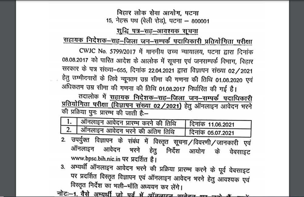 BPSC Recruitment 2021: बिहार पब्लिक सर्विस कमीशन ( BPSC) ने असिस्टेंट डायरेक्टर कम डिस्ट्रिक्ट पब्लिक रिलेशन ऑफिसर (DPRO) के पद पर भर्ती के लिए आवेदन मांगे हैं। इच्छुक उम्मीदवार इस पद के लिए बीपीएससी की आधिकारिक वेबसाइट bpsc.bih.nic.in पर ऑनलाइन आवेदन कर सकते हैं।
