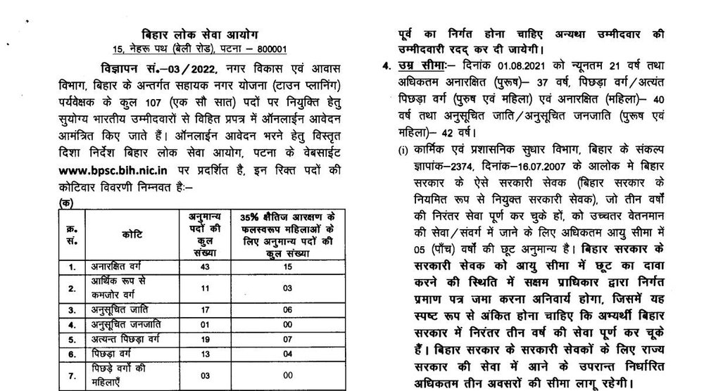 BPSC Recruitment 2022: बिहार लोक सेवा आयोग (BPSC) ने असिस्टेंट टाउन प्लानिंग सुपरवाइजर पदों पर भर्ती के लिए योग्य उम्मीदवारों से आवेदन मांगे हैं। सभी इच्छुक उम्मीदवार BPSC Assistant Town Planning Supervisor Recruitment 2022 के लिए आधिकारिक वेबसाइट bpsc.bih.nic.in पर 6 अप्रैल 2022 तक ऑनलाइन आवेदन कर सकते हैं।