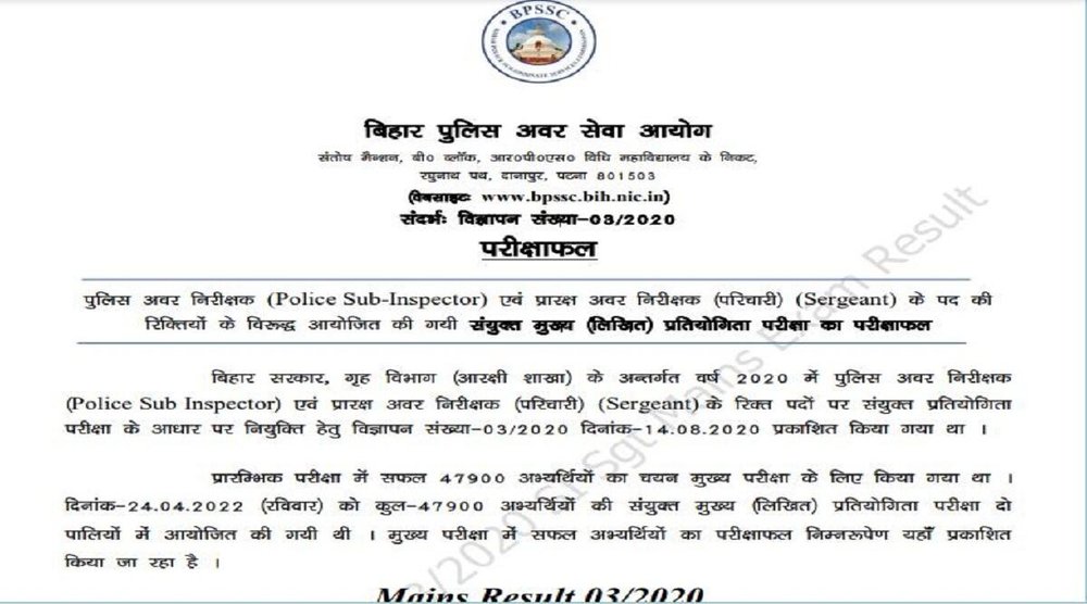 Bihar SI Main Result 2022: बिहार पुलिस अधीनस्थ सेवा आयोग (BPSSC) ने बिहार पुलिस एसआई मुख्य परीक्षा का रिजल्ट घोषित कर दिया है। अभ्यर्थी BPSSC की आधिकारिक वेबसाइट bpssc.bih.nic.in के जरिए अपने नतीजे चेक कर सकते हैं। मुख्य परीक्षा का आयोजन 24 अप्रैल 2022 को किया गया था।