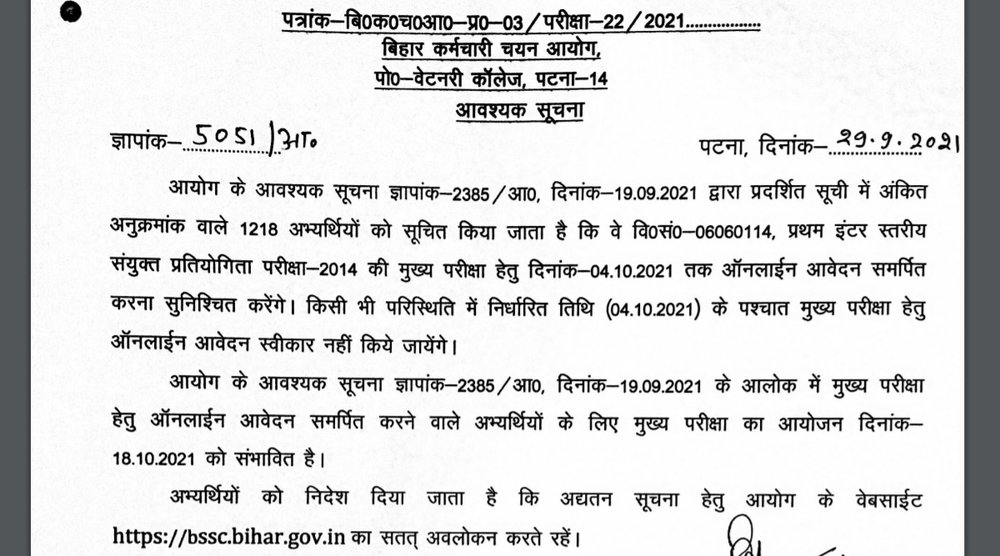 BSSC Exam Schedule 2021: बिहार स्टाफ सेलेक्शन कमीशन (BSSC) ने 1st Inter Level Combined Competitive (CC) Mains Exam 2021 की तारीख जारी कर दी है। जिन उम्मीदवारों ने 1st Inter Level Combined Competitive (CC) Mains Exam 2021 के लिए सफलता प्राप्त की है, वह अब आयोग की आधिकारिक वेबसाइट bssc.bih.nic.in पर परीक्षा का नोटिस चेक कर सकते हैं।