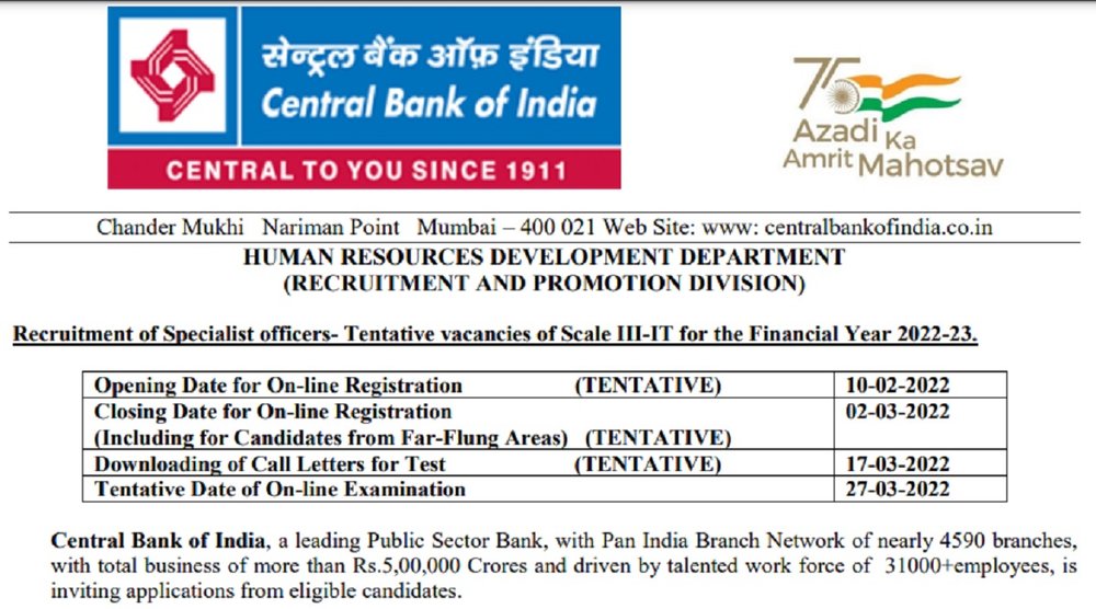 सेंट्रल बैंक ऑफ इंडिया ने स्पेशलिस्ट ऑफिसर के पदों पर भर्ती के लिए 10 फरवरी से ऑनलाइन आवेदन की प्रक्रिया शुरू कर दी है। बैंक 27 मार्च को ऑनलाइन परीक्षा आयोजित करेगा, जिसके लिए एडमिट कार्ड 17 मार्च 2022 को जारी किए जाएंगे। चयनित उम्मीदवारों को 63,840 रुपए से लेकर 78,230 रुपए तक वेतन दिया जाएगा।
