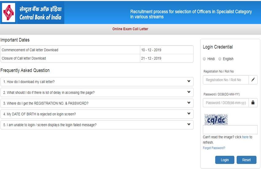 Central Bank SO Admit Card 2019: सेंट्रल बैंक ऑफ इंडिया (CBI) ने स्‍पेशलिस्‍ट ऑफिसर के पदों पर भर्ती के लिए आयोजित परीक्षा के लिए एडमिट कार्ड आधिकारिक वेबसाइट पर जारी कर दिए हैं। वे सभी उम्‍मीदवार जिन्‍होनें इस परीक्षा में शामिल होने के लिए आवेदन किया है, वे आधिकारिक वेबसाइट centralbankofindia.co.in पर विजिट कर अपना एडमिट कार्ड डाउनलोड कर सकते हैं। एडमिट कार्ड डाउनलोड करने का लिंक आधिकारिक वेबसाइट के होमपेज पर लाइव है।
