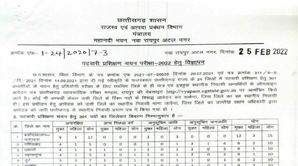 CG Vyapam Patwari Recruitment 2022: छत्तीसगढ़ व्यावसायिक परीक्षा मंडल रायपुर ने (CG Vyapam) ने पटवारी के पदों पर भर्तियां निकाली हैं। इन पदों के लिए अभ्यर्थी CG Vyapam की आधिकारिक वेबसाइट vyapam.cgstate.gov.in के जरिए 22 मार्च 2022 तक आवेदन कर सकते हैं।