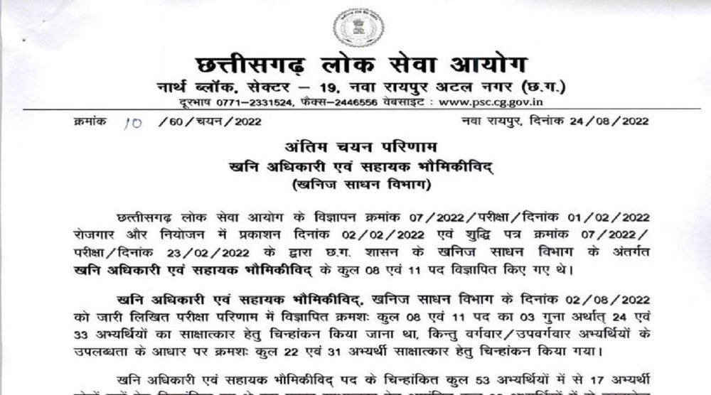 CGPSC Mining Officer Final Result 2022 Declared: छत्तीसगढ़ लोक सेवा आयोग (CGPSC) ने खनन अधिकारी और भूविज्ञानी भर्ती परीक्षा का फाइनल रिजल्ट घोषित कर दिया है। अभ्यर्थी आधिकारिक वेबसाइट psc.cg.gov.in के जरिए अपने नतीजे चेक कर सकते हैं। अंतिम चयन इंटरव्यू के आधार पर घोषित किया गया है।