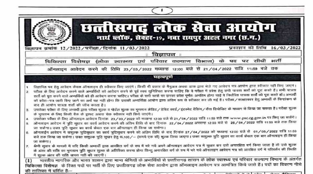 CGPSC Recruitment 2022: छत्तीसगढ़ लोक सेवा आयोग (CGPSC) ने मेडिकल स्पेशलिस्ट के पदों पर भर्तियों के लिए नोटिफिकेशन जारी किया है। इन पदों के लिए आवेदन की प्रक्रिया कल यानी 23 मार्च 2022 से शुरू होगी। अभ्यर्थी CGPSC की आधिकारिक वेबसाइट psc.cg.gov.in के जरिए इन पदों के लिए 21 अप्रैल 2022 तक आवेदन कर सकते हैं।