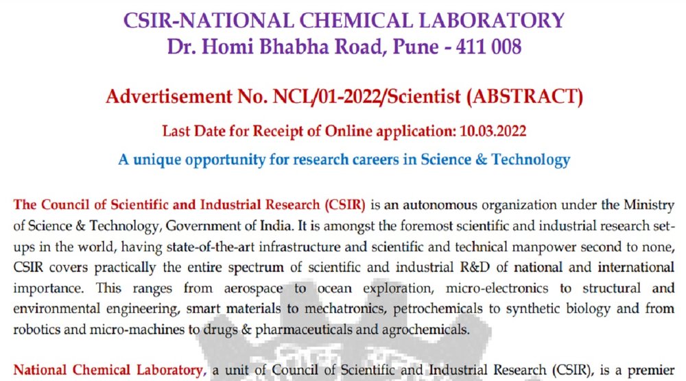 CSIR-National Chemical Laboratory Recruitment 2022: सीएसआईआर-नेशनल केमिकल लेबोरेटरी पुणे में कई पदों पर भर्ती निकली है। इस भर्ती अभियान के तहत साइंटिस्ट, सीनियर साइंटिस्ट और प्रिंसिपल साइंटिस्ट के पदों पर भर्ती के लिए आवेदन आमंत्रित किया गया है। इन पदों के लिए आवेदन प्रक्रिया जारी है और उम्मीदवार 10 मार्च तक ऑनलाइन आवेदन कर सकते हैं। आवेदनों की हार्ड कॉपी प्राप्त करने की अंतिम तिथि 21 मार्च है। इच्छुक और योग्य उम्मीदवार सीएसआईआर-एनसीएल की आधिकारिक वेबसाइट recruitment.ncl.res.in पर जाकर विस्तृत अधिसूचना देख सकते हैं।
