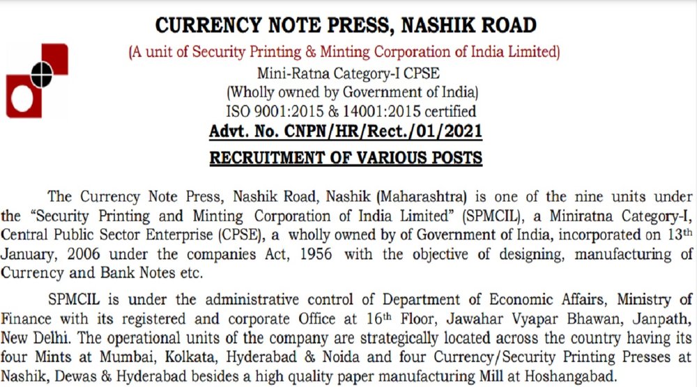 Currency Note Press Nashik Recruitment 2022: करेंसी नोट प्रेस नासिक वेलफेयर ऑफिसर, सुपरवाइजर, जूनियर टेक्नीशियन, जूनियर ऑफिस असिस्टेंट सहित कई पदों पर भर्ती करने जा रही है। इसके लिए आधिकारिक वैबसाइट पर https://cnpnashik.spmcil.com 149 पदों के लिए आवेदन आमंत्रित किए गए हैं। इच्छुक और योग्य उम्मीदवार 25 जनवरी 2022 तक या उससे पहले आवेदन कर सकते हैं।