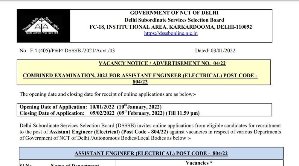 DSSSB Recruitment 2022: दिल्ली सबोर्डिनेट सर्विस सेलेक्शन बोर्ड (DSSSB) ने असिस्टेंट इंजीनियर पदों पर भर्ती के लिए एक नोटिफिकेशन जारी किया है। सभी इच्छुक और योग्य उम्मीदवार DSSSB AE Recruitment 2022 के लिए बोर्ड की आधिकारिक वेबसाइट dsssbonline.nic.in पर 9 फरवरी 2022 तक ऑनलाइन आवेदन कर सकते हैं। इन पदों पर भर्ती के लिए आवेदन प्रक्रिया 10 जनवरी 2022 से शुरू की जाएगी।