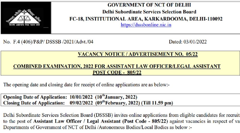 DSSSB Recruitment 2022: दिल्ली अधीनस्थ सेवा चयन बोर्ड (DSSSB) ने ऑफिसर के पदों पर योग्य उम्मीदवारों से आवेदन मांगे हैं। आधिकारिक नोटिफ्केशन के अनुसार, 26 असिस्टेंट लॉ ऑफिसर / लीगल असिस्टेंट पदों के लिए आज यानी 10 जनवरी, 2022 से आवेदन प्रक्रिया शुरू हो गई है। सभी इच्छुक उम्मीदवार आधिकारिक वेबसाइट dsssb.delhi.gov.in पर जाकर आवेदन कर सकते हैं।