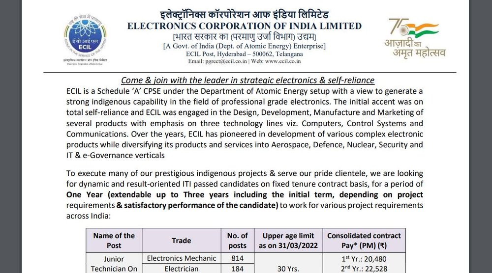 ECIL Recruitment 2022: इलेक्ट्रॉनिक्स कॉरपोरेशन ऑफ इंडिया लिमिटेड (ECIL) ने जूनियर टेक्नीशियन पदों पर भर्ती के लिए योग्य उम्मीदवारों से ऑनलाइन आवेदन मांगे हैं। सभी योग्य उम्मीदवार ECIL Junior Technician Recruitment 2022 के लिए आधिकारिक वेबसाइट पर 11 अप्रैल 2022 तक आवेदन कर सकते हैं। इन पदों पर भर्ती के लिए आवेदन प्रक्रिया 1 अप्रैल से शुरू की जा चुकी है।