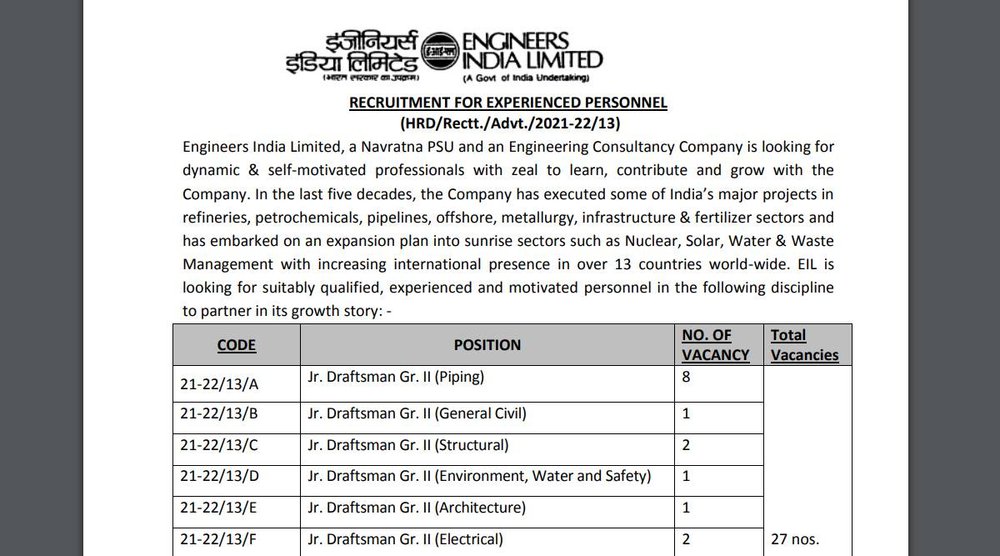 EIL Recruitment 2022: इंजीनियर्स इंडिया लिमिटेड (EIL), दिल्ली ने जूनियर ड्राफ्ट्समैन पदों पर भर्ती के लिए योग्य उम्मीदवारों से आवेदन मांगे हैं। सभी उम्मीदवार EIL Junior Draftsman Recruitment 2022 के लिए आधिकारिक वेबसाइट engineersindia.com पर 18 अप्रैल 2022 तक ऑनलाइन आवेदन कर सकते हैं।