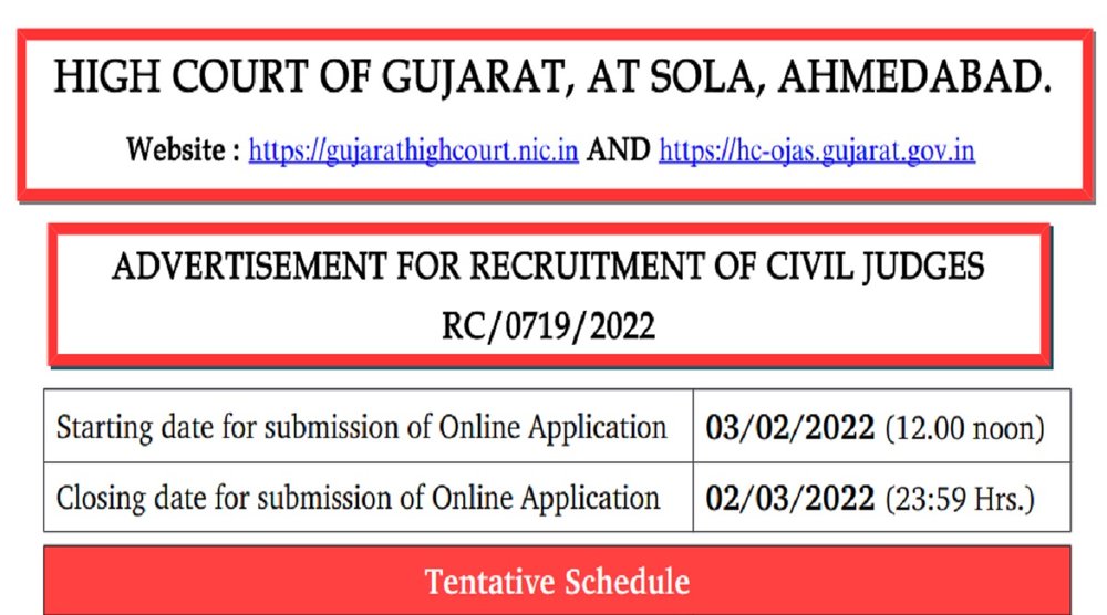 Gujarat High Court Recruitment 2022 Notification: गुजरात उच्च न्यायालय ने सिविल जज के पद पर भर्ती के लिए अधिसूचना जारी की है। मान्यता प्राप्त विश्वविद्यालय से कानून में डिग्री की अपेक्षित योग्यता रखने वाले उम्मीदवार 3 फरवरी 2022 से 2 मार्च 2022 तक ऑनलाइन मोड के माध्यम से पदों पर आवेदन कर सकते हैं।