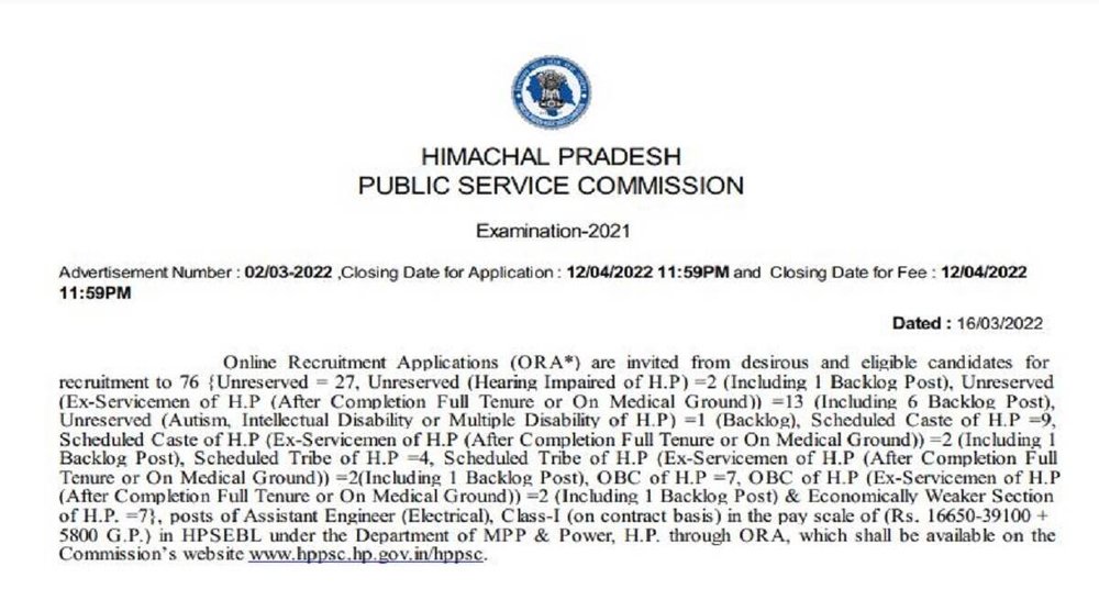 HPPSC Recruitment 2022: हिमाचल प्रदेश लोक सेवा आयोग (Himachal Pradesh Public Service Commission) ने असिस्टेंट इंजीनियर के पदों पर भर्तियों के लिए विज्ञापन जारी किया है। इन पदों के लिए आवेदन की प्रक्रिया जारी है। अभ्यर्थी HPPSC की आधिकारिक वेबसाइट hppsc.hp.gov.in के जरिए 12 अप्रैल 2022 तक आवेदन कर सकते हैं।