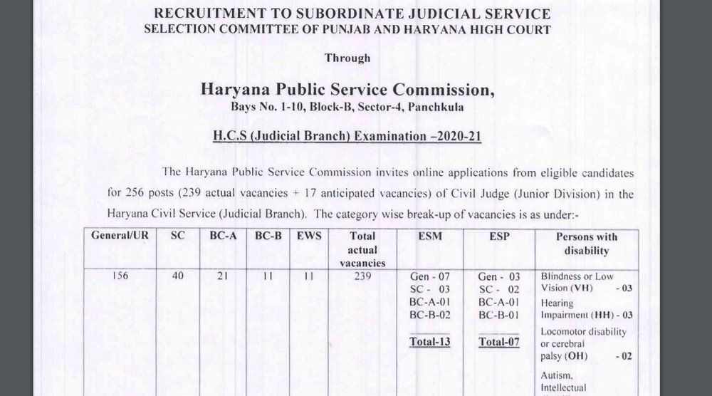 HPSC Recruitment 2021 के माध्यम से सिविल जज के कुल 256 पदों पर भर्ती की जाएगी। इन पदों पर भर्ती के लिए उम्मीदवार के पास किसी मान्यता प्राप्त विश्वविद्यालय से लॉ में बैचलर्स की डिग्री होनी चाहिए। इसके अलावा उम्मीदवार की आयु 21 साल से 42 साल के बीच होनी चाहिए। हालांकि, आरक्षित कैटेगरी के उम्मीदवारों को आयु सीमा में छूट दी जाएगी। विस्तृत जानकारी के लिए उम्मीदवार आधिकारिक नोटिफिकेशन चेक कर सकते हैं।