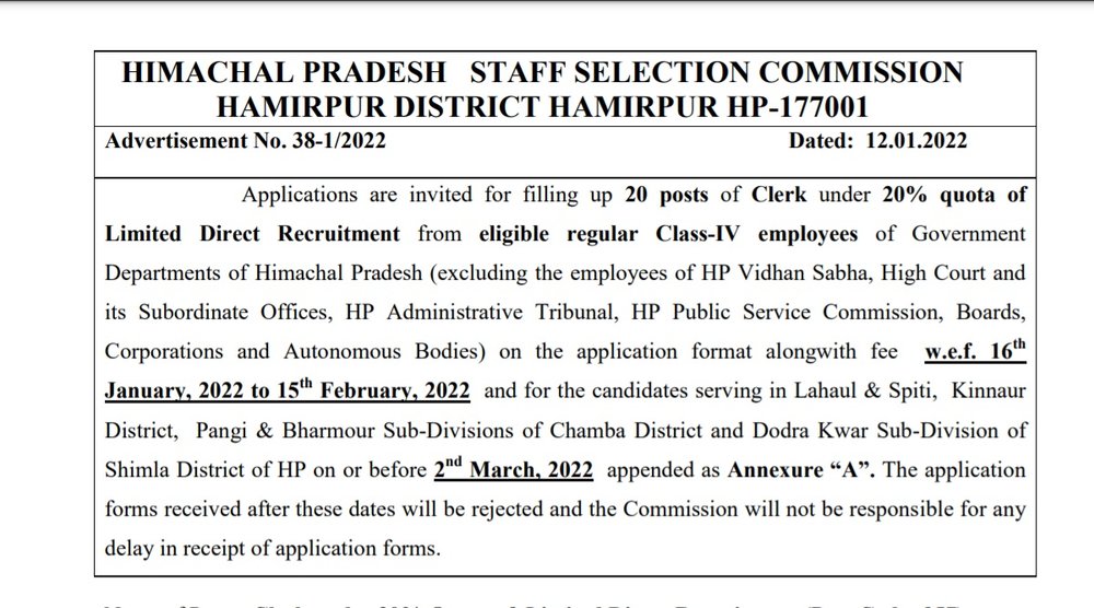 HPSSC Recruitment 2022: हिमाचल प्रदेश स्टाफ सेलेक्शन कमिशन (HPSSC) ने क्लर्क पदों पर भर्ती के लिए योग्य उम्मीदवारों से आवेदन मांगे हैं। सभी इच्छुक उम्मीदवार HPSSC Clerk Recruitment 2022 के लिए आधिकारिक वेबसाइट hpsssb.hp.gov.in पर 16 जनवरी 2022 से ऑनलाइन आवेदन कर सकते हैं। इन पदों पर भर्ती के लिए आवेदन करने की आखिरी तारीख 15 फरवरी 2022 निर्धारित की गई है।