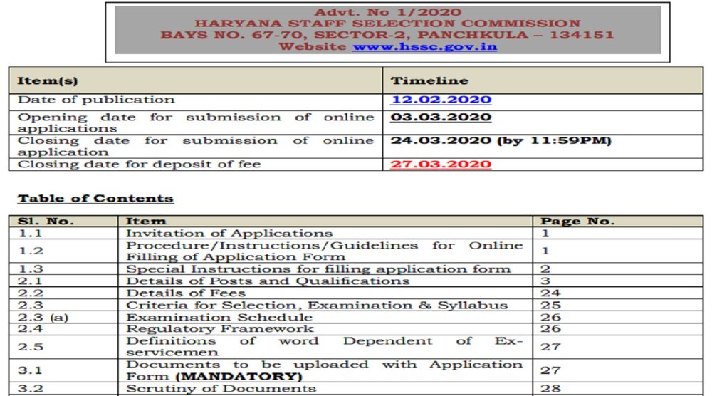 हरियाणा कर्मचारी चयन आयोग (HSSC) द्वारा जारी नोटिफिकेशन के अनुसार इलेक्शन नायब तहसीलदार के 6 पद, इलेक्शन कानूनगो के 21, वर्क सुपरवाइजर के 112 पद, ऑटो डीजल मैकेनिक के 39 पद, कारपेंटर के 33 पद, प्लम्बर के 4 पद, रिसेप्शनिस्ट-कम-टेलीफोन ऑपरेटर के 9 पद, सर्वेयर के 1 पद, पेंटर के 27 पद, मेसन के 23 पद, मैकेनिक (एयर कंडीशनिंग और रेफ्रिजरेशन) के 7 पद, लिफ्ट ऑपरेटर के 2 पद, चार्जमैन के 2 पद, चार्जमैन (इलेक्ट्रिकल) के 10 पद इलेक्ट्रीशियन के 115 पद, मशीन टूल ऑपरेटर के 7 पद, ऑटो इलेक्ट्रीशियन के 11 पद, स्टोर कीपर के 15 पद, फिटर हेवी मशीन के 39 पद, सुपरवाइजर के 12 पद, वर्कशॉप मशीनरी ऑपरेटर के 14 पद, चार्जमैन हेवी प्लांट के 14 पद, इंस्पेक्टर के 32 पद, सेक्शन ऑफिसर के 5 पद, सब स्टेशन जेनरेटर अटेंडेंट के 2 पद, इलेक्ट्रीशियन के 4 पद, जूनियर मैकेनिक के 10 पद, अकाउंट क्लर्क के 11 पद, स्टोर कीपर के 3 पद और स्टोर क्लर्क के 6 पद सहित कई अन्य पदों के लिए ऑनलाइन आवेदन कर सकते हैं।