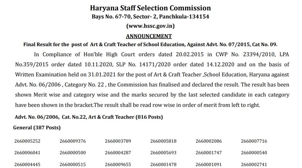 इस भर्ती प्रक्रिया के माध्यम से हरियाणा एजुकेशन डिपार्टमेंट में कुल 816 रिक्त पदों पर भर्ती की जाएगी। इसके लिए हरियाणा कर्मचारी चयन आयोग द्वारा लिखित परीक्षा 31 जनवरी 2021 को आयोजित की गई थी। जिसके बाद उन्हें इंटरव्यू के लिए बुलाया गया था। जानकारी के लिए बता दें कि लिखित परीक्षा 200 अंको की थी। जबकि, इंटरव्यू 25 अंकों के लिए आयोजित किया गया था। सभी उम्मीदवार आधिकारिक वेबसाइट पर इन स्टेप्स के माध्यम से आर्ट और क्राफ्ट टीचर भर्ती परीक्षा का फाइनल रिजल्ट डाउनलोड कर सकते हैं।