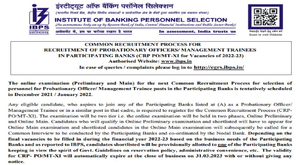 IBPS PO Recruitment 2021: बैंकिंग कार्मिक चयन संस्थान (IBPS) ने प्रोबेशनरी ऑफिसर / मैनेजमेंट ट्रेनी (पीओ / एमटी) की भर्ती के लिए ऑनलाइन आवेदन लिंक एक्टिव कर दिया है। उम्मीदवार इस भर्ती प्रक्रिया के लिए बैंकिंग कार्मिक चयन संस्थान (IBPS) की ऑफिशियल वेबसाइट ibps.in पर 10 नवंबर 2021 तक आवेदन कर सकते हैं।