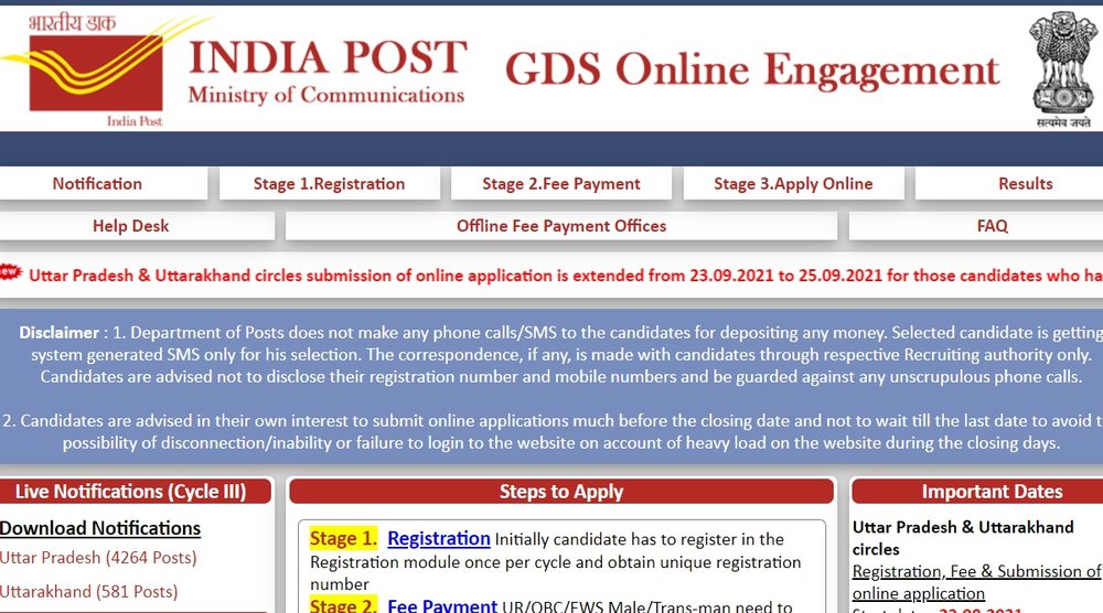India Post Recruitment 2021: भारतीय डाक ने उत्तर प्रदेश और उत्तराखंड पोस्टल सर्कल में ग्रामीण डाक सेवक (GDS) के पदों पर भर्ती के लिए योग्य उम्मीदवारों से आवेदन मांगे हैं। ताजा जानकारी के अनुसार, अब सभी रजिस्टर्ड उम्मीदवार इन पदों पर भर्ती के लिए आधिकारिक वेबसाइट appost.in/gdsonline पर 25 सितंबर 2021 तक आवेदन कर सकते हैं। इससे पहले आवेदन करने की आखिरी तारीख 23 सितंबर 2021 थी।