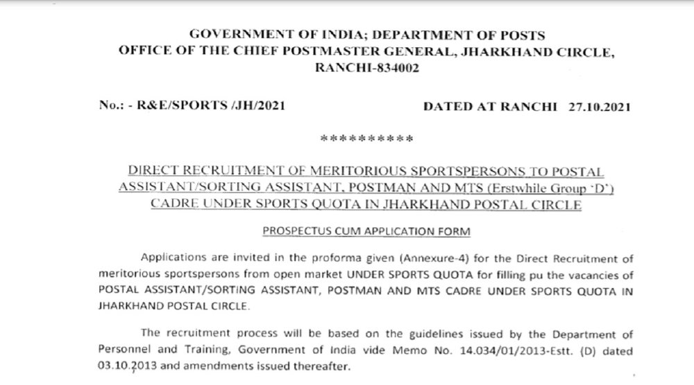 इन पदों पर भर्ती स्पोर्ट्स कोटा के तहत होगी। नौकरी के नोटिफिकेशन के तहत पोस्टल असिस्टेंट/सॉर्टिंग असिस्टेंट के 6 पद, पोस्टमैन के 5 पद और मल्टी टास्किंग स्टाफ के 8 पद खाली हैं।