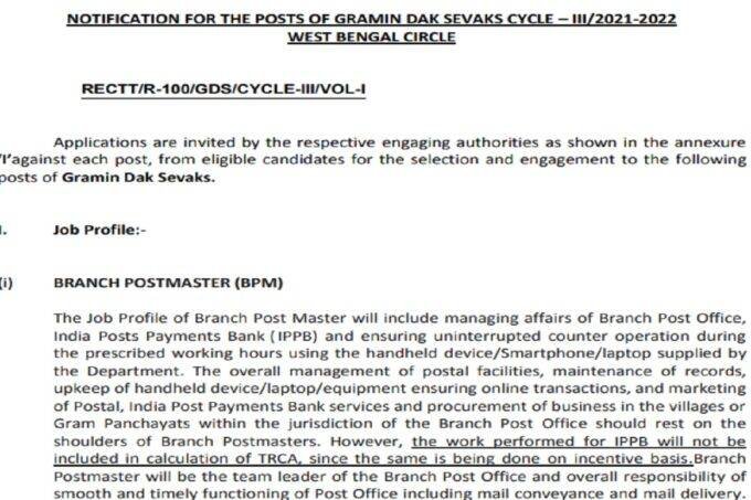 India Post Recruitment 2021: इंडिया पोस्ट (India Post) पश्चिम बंगाल ने ग्रामीण डाक सेवक (GDS) के पद पर भर्ती के लिए एक अधिसूचना जारी की है। इच्छुक उम्मीदवार पोर्टल में indiapost.gov.in या appost.in/gdsonline के माध्यम से 20 जुलाई 2021 से 19 अगस्त 2021 तक ऑनलाइन आवेदन कर सकते हैं। इस भर्ती प्रक्रिया के माध्यम से कुल 2357 रिक्त पदों पर भर्ती की जाएगी। उम्मीदवारों का चयन मेरिट लिस्ट के आधार पर किया जाएगा।