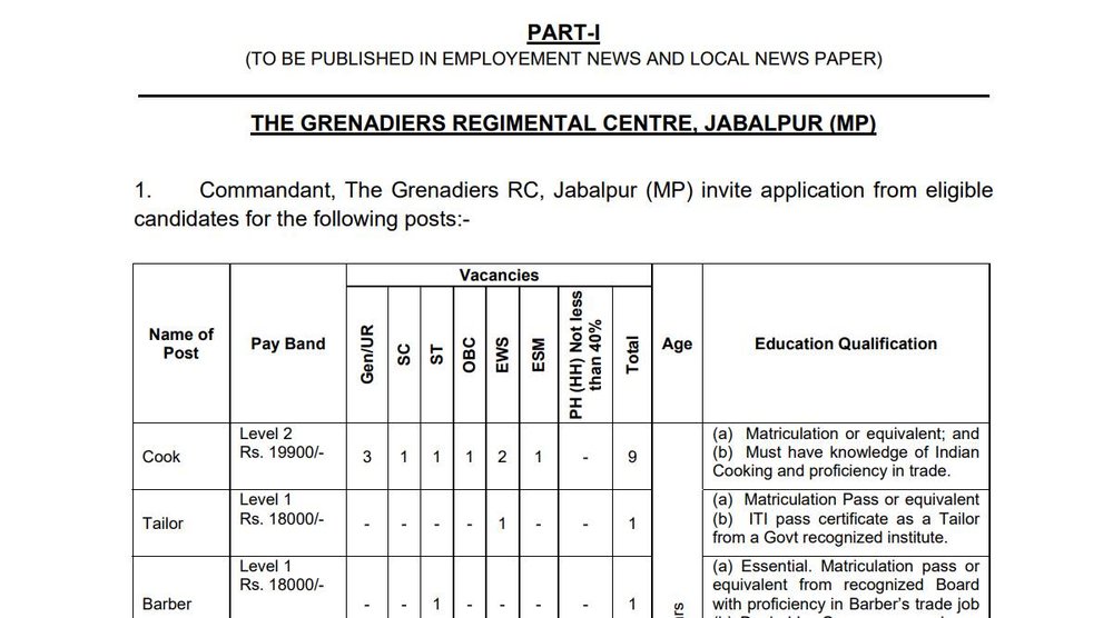 ऐसे करना होगा आवेदन: सभी योग्य उम्मीदवार ग्रेनेडियर्स रेजिमेंटल सेंटर में इन पदों पर भर्ती के लिए निर्धारित प्रारूप में अपना आवेदन और अन्य आवश्यक दस्तावेज कमांडेंट, ग्रेनेडियर्स रेजिमेंटल सेंटर, जबलपुर, मध्य प्रदेश – 482001 पर रोजगार समाचार में विज्ञापन जारी होने के 30 दिन के अंदर तक भेज सकते हैं। सभी उम्मीदवार आवेदन करने से पहले नोटिफिकेशन के माध्यम से अपनी योग्यता अवश्य जांच लें। अधिक जानकारी के लिए आधिकारिक वेबसाइट पर चेक कर सकते हैं।