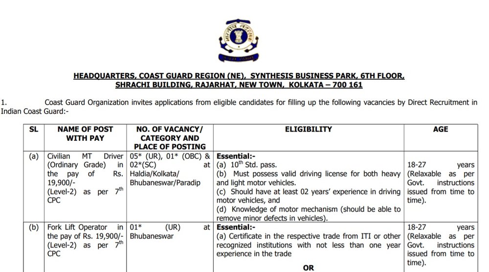 इंडियन कोस्ट गार्ड में ग्रुप सी के विभिन्न पदों पर भर्ती के लिए उम्मीदवार किसी मान्यता प्राप्त बोर्ड से कक्षा 10वीं पास होना चाहिए। साथ ही उम्मीदवारों को संबंधित क्षेत्र में कुछ साल का अनुभव भी होना चाहिए। आयु सीमा की बात करें तो इंजन ड्राइवर और लस्कर पद पर आवेदन करने के लिए उम्मीदवार की आयु 18 साल से 30 साल के बीच होनी चाहिए। जबकि, अन्य पदों पर भर्ती के लिए न्यूनतम आयु 18 साल और अधिकतम आयु 27 साल निर्धारित की गई है। हालांकि, सरकारी नियमों के अनुसार आरक्षित कैटेगरी के उम्मीदवारों को आयु सीमा में छूट दी जाएगी। विस्तृत जानकारी के लिए उम्मीदवार आधिकारिक नोटिफिकेशन चेक कर सकते हैं।