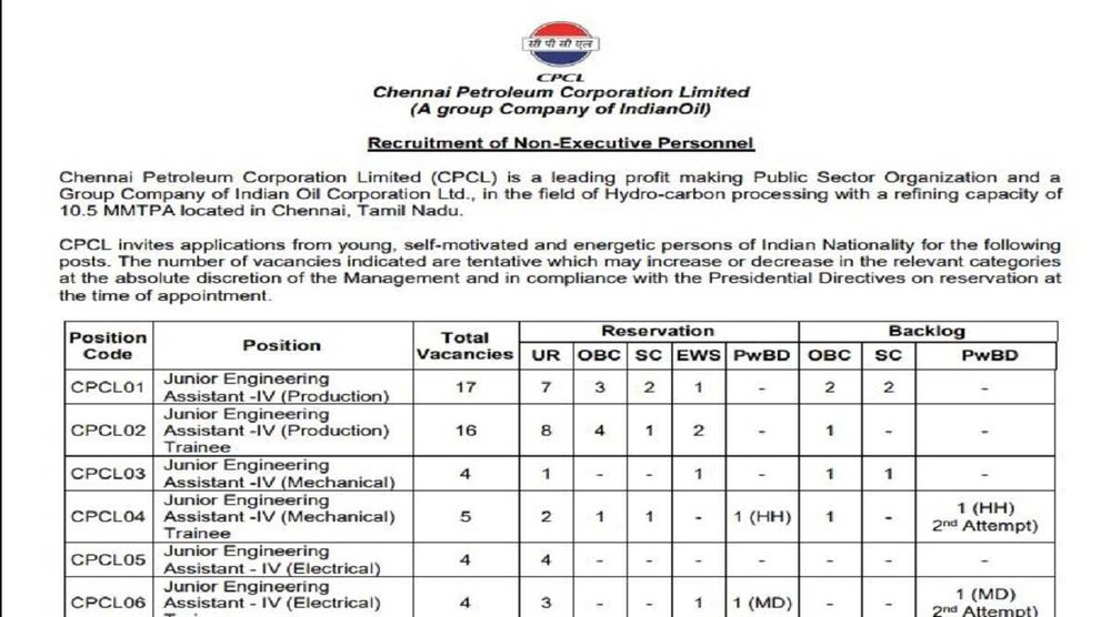 Indian Oil JE Recruitment 2022: चेन्नई पेट्रोलियम कॉर्पोरेशन लिमिटेड (CPCL) ने जूनियर इंजीनियर के विभिन्न रिक्त पदों पर भर्तियों के लिए नोटिफिकेशन जारी किया है। इन पदों के लिए 24 मार्च 2022 से आवेदन की प्रक्रिया जारी है। अभ्यर्थी आधिकारिक वेबसाइट cpcl.co.in के जरिए इन पदों के लिए 14 अप्रैल 2022 तक आवेदन कर सकते हैं।