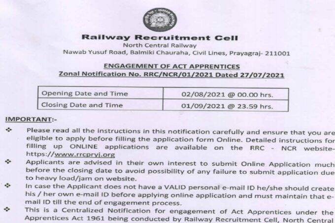 Railway Recruitment 2021: भारतीय रेलवे (ndian Railways) की रिक्रूटमेंट सेल ने विभिन्न विभागों में अप्रेंटिस के 1600 से अधिक पदों के लिए नौकरी के लिए आवेदन मांगे हैं। भारतीय रेलवे ने अपनी ऑफिशियल नोटिफिकेशन में जानकारी दी है कि उत्तर मध्य रेलवे में चयनित उम्मीदवारों को विभिन्न डिवीजनों और कार्यशालाओं में प्रशिक्षित किया जाएगा।