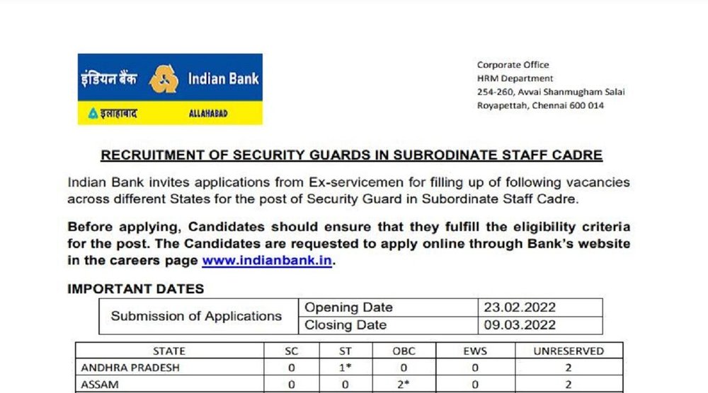 Indian Bank Recruitment 2022: इंडियन बैंक ने सुरक्षा गार्ड के रिक्त पदों पर भर्तियां निकाली हैं। इन पदों के लिए आवेदन की प्रक्रिया जारी है और लास्ट डेट कल है। ऐसे में जिन अभ्यर्थियों ने अभी तक इन पदों के लिए आवेदन नहीं किया है। वह आधिकारिक वेबसाइट indianbank.in के जरिए 9 मार्च 2022 तक आवेदन कर सकते हैं।