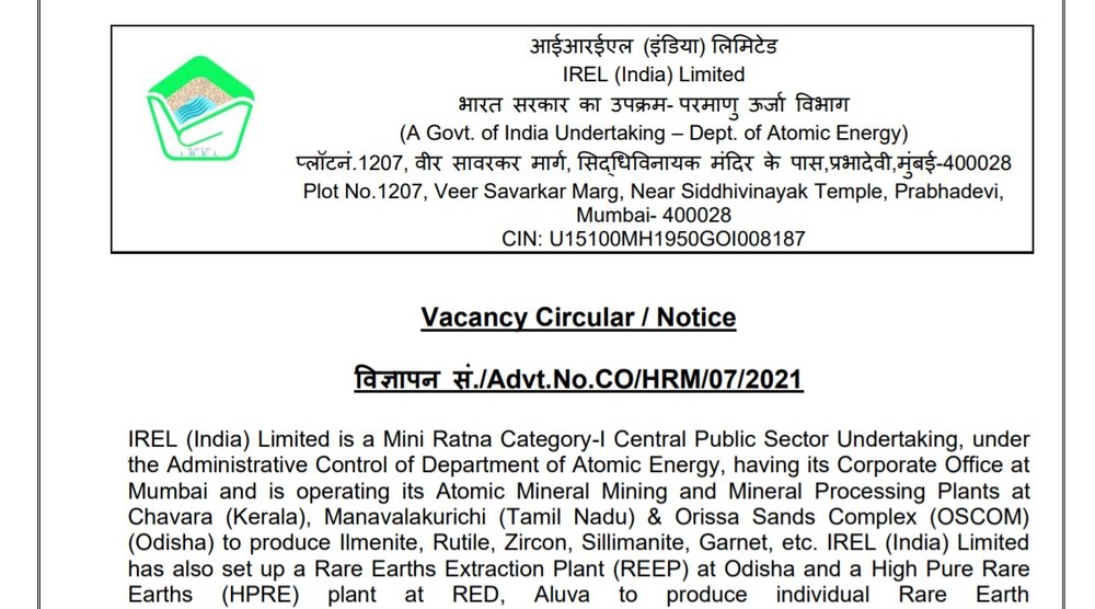 IREL Recruitment 2021: इंडियन रेयर अर्थ लिमिटेड (IREL) ने विज्ञापन संख्या CO/HRM/07/2021 के तहत ग्रेजुएट / डिप्लोमा ट्रेनी, सुपरवाइजर और अन्य पदों पर भर्ती के लिए योग्य उम्मीदवारों से आवेदन मांगे हैं। इच्छुक उम्मीदवार इन पदों पर भर्ती के लिए आधिकारिक वेबसाइट irel.co.in पर 5 अक्टूबर तक या उससे पहले ऑनलाइन आवेदन कर सकते हैं। आवेदन प्रक्रिया 15 सितंबर से शुरू की जा चुकी है।