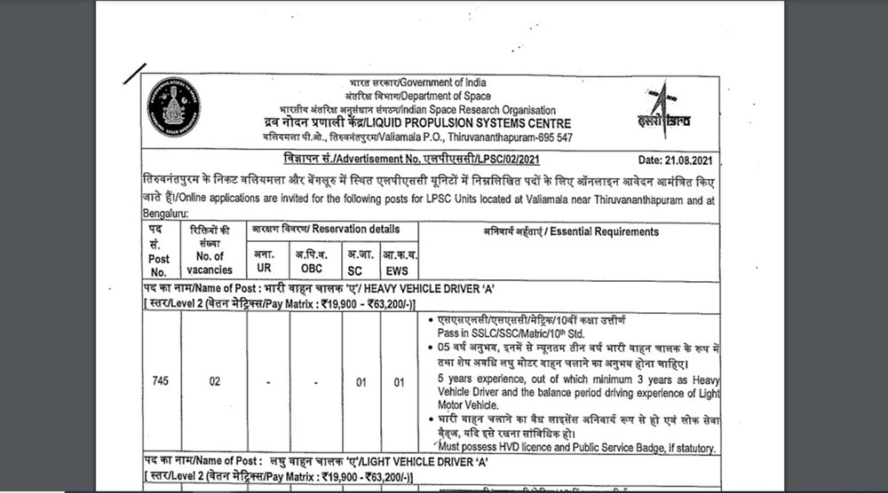 ISRO Notification: इसरो-लिक्विड प्रोपल्शन सिस्टम सेंटर ने लाइट व्हीकल ड्राइवर, कुक, फायरमैन और अन्य पदों पर भर्ती के लिए नोटिफिकेशन जारी किया है। आवेदक 06 सितंबर 2021 तक लिक्विड प्रोपल्शन सिस्टम सेंटर (LPSC) नौकरी अधिसूचना 2021 के लिए आवेदन कर सकते हैं। इस भर्ती प्रक्रिया से भारी वाहन चालक के 2 पद, हल्का वाहन चालक के 2 पद, कुक का 1 पद, फायरमैन के 2 पद और कैटरिंग अटेंडेंट का 1 पद भरा जाएगा।
