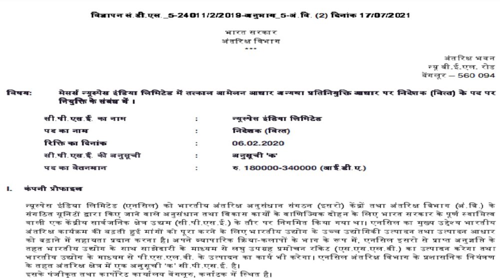 ISRO Notification 2021: भारतीय अंतरिक्ष अनुसंधान संगठन (ISRO) के न्यूस्पेस इंडिया लिमिटेड में निदेशक के पद रिक्त हैं। इसके लिए ISRO ने अपनी ऑफिशियल वेबसाइट isro.gov.in पर नोटिफिकेशन भी जारी किया था। रिक्त पदों की कुल संख्या 2 हैं ये दो पद हैं निदेशक (फाइनेंस) और निदेशक (तकनीकी तथा कार्यनीति)। इन पदों पर आवेदन करने की अंतिम तिथि 27 अगस्त, 2021 है।