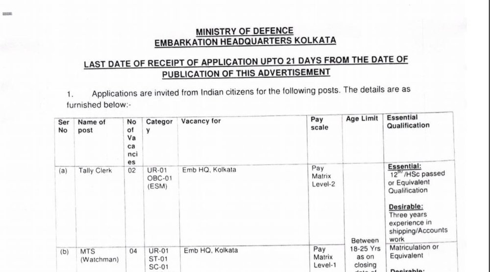 Ministry of Defence Recruitment 2022: रक्षा मंत्रालय, एंबरकेशन हेड क्वार्टर, कोलकाता ने टैली क्लर्क, मल्टी टास्किंग स्टाफ और कुक सहित विभिन्न पदों पर भर्ती के लिए योग्य उम्मीदवारों से आवेदन मांगे हैं। सभी इच्छुक उम्मीदवार इन पदों पर भर्ती के लिए रोजगार समाचार में विज्ञापन जारी होने के 21 दिन के अंदर यानी 26 फरवरी 2022 तक निर्धारित प्रारूप में आवेदन कर सकते हैं।