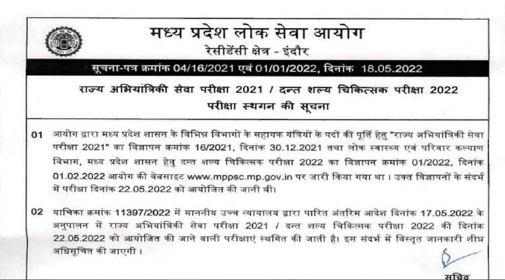 वहीं आयोग ने दंत शल्य चिकित्सक परीक्षा 2022 को भी स्थगित कर दिया है। जल्द की इस परीक्षा की नई तिथियां घोषित की जाएंगी। मीडिया रिपोर्ट्स के अनुसार अदालत ने आदेश दिया है कि अन्य राज्यों के उम्मीदवारों को इसके लिए और समय दिया जाना चाहिए। रोजगार पंजीकरण की आवश्यकता को समाप्त करके आवेदन दाखिल करें। दरअसल, मप्र हाईकोर्ट में 17 मई को सुनवाई के बाद अन्य राज्यों के अभ्यर्थियों की ओर से हाईकोर्ट में दायर याचिका पर इसे सुरक्षित रखा गया था. इस मामले में कोर्ट ने 18 मई को आदेश जारी किया था.