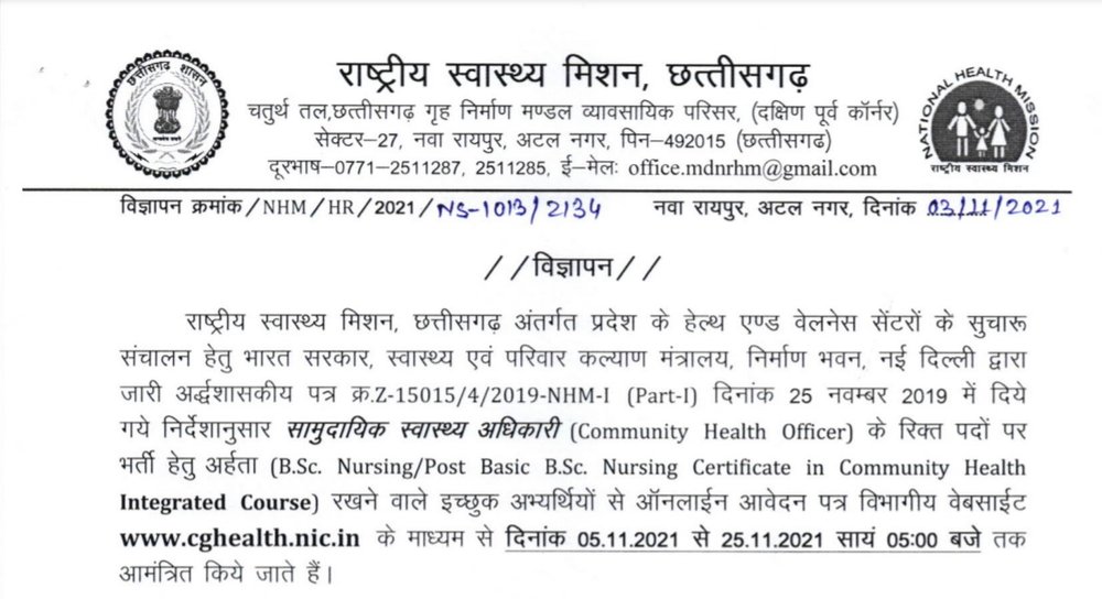 NHM CG CHO Recruitment 2021: नेशनल हेल्थ मिशन छत्तीसगढ़ के लिए कम्यूनिटी हेल्थ ऑफिसर के 2700 पदों पर भर्ती निकली है। भर्ती की प्रकिया पूरी तरह से ऑनलाइन है और 5 नवंबर से इसके लिए आवेदन शुरू हो चुके हैं।