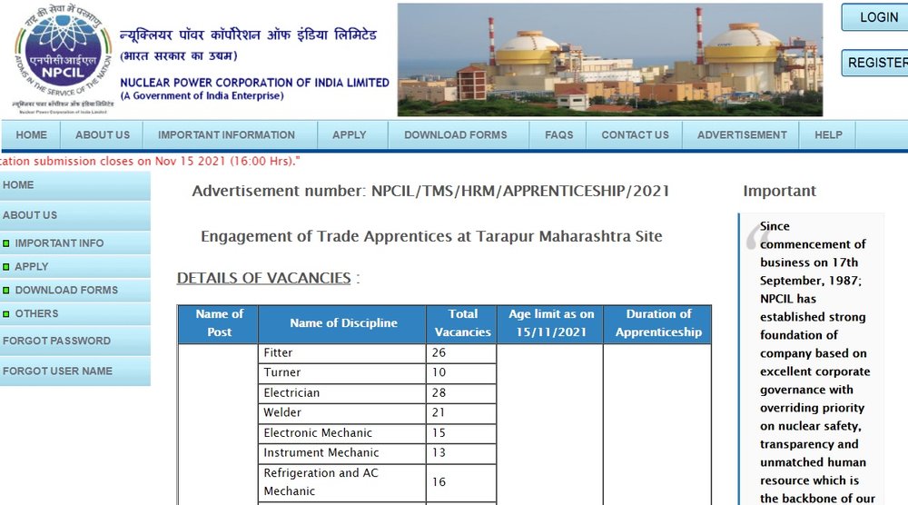 NPCIL Recruitment 2021: न्यूक्लियर पावर कॉर्पोरेशन ऑफ इंडिया लिमिटेड (NPCIL) ने ट्रेड अप्रेंटिस पदों पर भर्ती के लिए योग्य उम्मीदवारों से आवेदन मांगे हैं। सभी इच्छुक उम्मीदवार NPCIL Apprentice Recruitment 2021 के लिए आधिकारिक वेबसाइट npcilcareers.co.in पर 15 नवंबर 2021 तक ऑनलाइन आवेदन कर सकते हैं। इन पदों पर भर्ती के लिए आवेदन प्रक्रिया 28 अक्टूबर से शुरू की जा चुकी है।